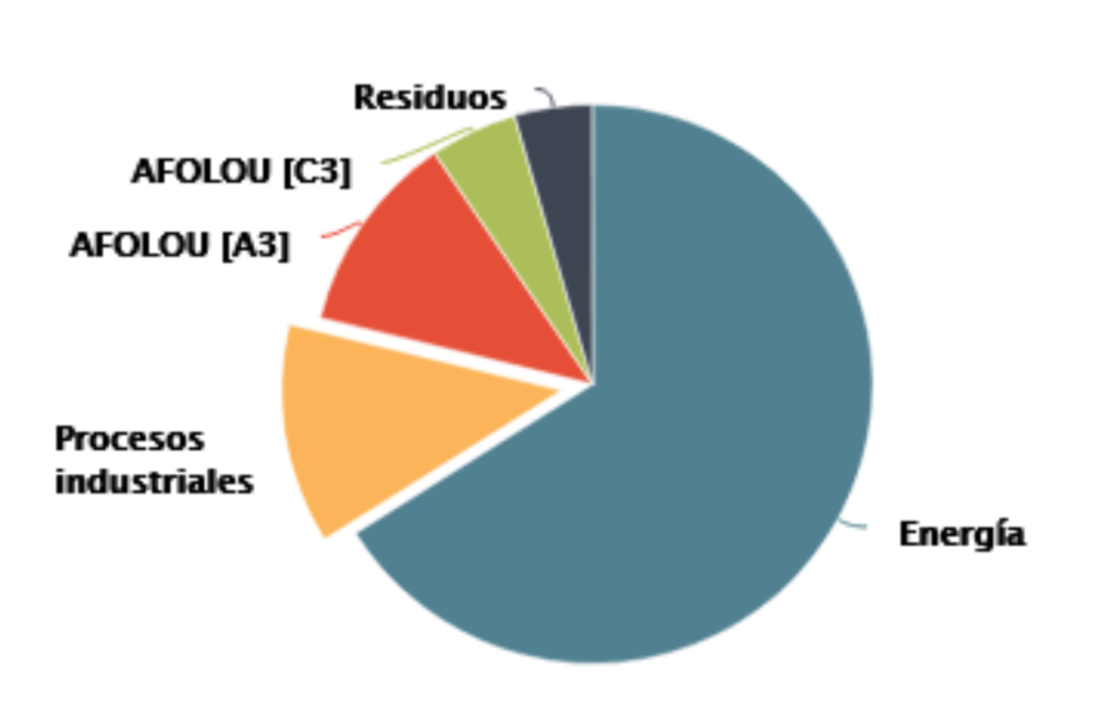 En la Figura 1 se muestran la contribución de GEI por sector. Estos datos se recolectaron en un periodo que comprende entre 1990-2015. Donde se puede identificar que más del 50% de las emisiones GEI son responsabilidad de la energía con 66.1%, seguido de los procesos industriales con 12.7% que además de los procesos industriales también contempla el uso de los productos; Agricultura, el Sector Forestal y Cambio de Uso de Suelo (AFOLOU) específicamente la ganadería con el 11.7% y fuentes de emisión distintas al dióxido de carbono (CO2) de la tierra con 5%, finalmente el 4% restante corresponde a los residuos. Donde también se encuentra en la Figura 3, la contribución de los gases en porcentaje, predominando el CO2 con 71.97%, metano (CH4) con 20.32%, óxido nitroso (N2O) con 5.88%, híbrido de fibra coaxial (HFC) y hexafluoruro de azufre con 0.03% (INECC, 2018).